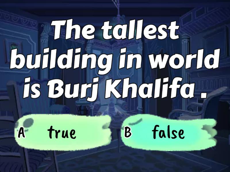 1) The tallest building in world is Burj Khalifa . a) true b) false 2) It is the smallest building in Dubai. a) true b) false 3) No other building has a long water supply line as the Burj Khalifa has. a) true b) false 4) It's lift system is longest one in the world. a) true b) false 5) It's cost was higher then any other building in the world. a) true b) false