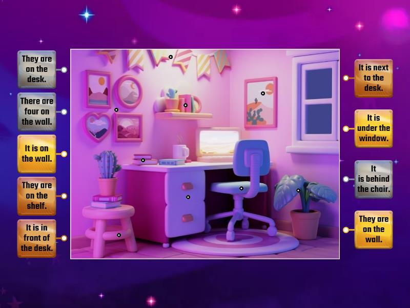 They are on the wall., There are four on the wall., They are on the shelf., It is on the wall., They are on the desk., It is in front of the desk., It is under the window., It is behind the chair., It is next to the desk..