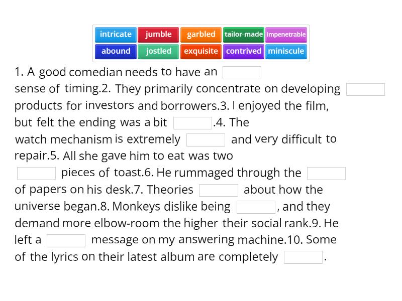 1. A good comedian needs to have an ____ sense of timing.2. They primarily concentrate on developing ____ products for investors and borrowers.3. I enjoyed the film, but felt the ending was a bit ____.4. The watch mechanism is extremely ____ and very difficult to repair.5. All she gave him to eat was two ____ pieces of toast.6. He rummaged through the ____ of papers on his desk.7. Theories ____ about how the universe began.8. Monkeys dislike being ____, and they demand more elbow-room the higher their social rank.9. He left a ____ message on my answering machine.10. Some of the lyrics on their latest album are completely ____.
