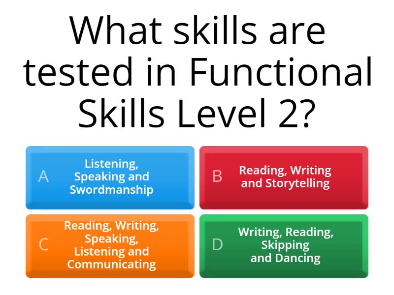 1) What skills are tested in Functional Skills Level 2? a) Listening, Speaking and Swordmanship b) Reading, Writing and Storytelling c) Reading, Writing, Speaking, Listening and Communicating d) Writing, Reading, Skipping and Dancing 2) How many tests are there? a) One b) Two c) Three d) 45,2395809 e) 4 3) In the Reading test, you have to read a range of texts and answer questions on them. T/F? a) T b) F 4) In the Reading test, you won't lose marks if you make spelling, punctuation or grammar mistakes. T/F? a) T b) F 5) In the Reading test, you must write in full sentences. T/F? a) T b) F 6) How long do you get for each test? a) 45 mins b) 75 mins c) 60 mins d) 120 mins 7) How many texts do you have to write in the writing test? a) one b) two c) five d) seven 8) In the writing test, you will lose marks for spelling, punctuation or grammar mistakes. T/F? a) T b) F 9) Which types of text might you be asked to write? a) A letter b) An email c) An article d) A report e) A leaflet f) A novel 10) To get a Functional Skills qualification, you must pass all three parts. T/F? a) T b) F