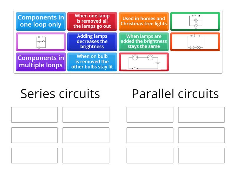 Series circuits: , , Components in one loop only, When one lamp is removed all the lamps go out, Adding lamps decreases the brightness, Parallel circuits: , , Components in multiple loops, When on bulb is removed the other bulbs stay lit, When lamps are added the brightness stays the same, Used in homes and Christmas tree lights,