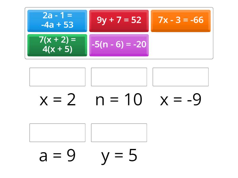 9y + 7 = 52 - y = 5, 7x - 3 = -66 - x = -9, 2a - 1 = -4a + 53 - a = 9, -5(n - 6) = -20 - n = 10, 7(x + 2) = 4(x + 5) - x = 2,