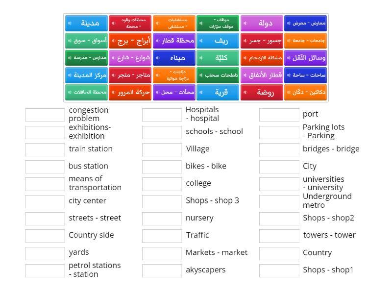قرية - Village, دولة - Country, ريف - Country side, أبراج - برج - towers - tower, ناطحات سحاب - akyscapers, مدينة - City, متاجر - متجر - Shops - shop1, محلّات - محل - Shops - shop2, دكاكين - دكّان - Shops - shop 3, مركز المدينة - city center , قطار الأنفاق - Underground metro, محطّات وقود - محطة - petrol stations - station, مواقف - موقف سيّارات - Parking lots - Parking, محطّة قطار - train station, محطة الحافلات - bus station, وسائل النّقل - means of transportation, درّاجات - درّاجة هوائية - bikes - bike, مدارس - مدرسة - schools - school, جامعات - جامعة - universities - university, كليّة - college , روضة - nursery, معارض - معرض - exhibitions- exhibition , شوارع - شارع - streets - street, حركة المرور - Traffic, مشكلة الازدحام - congestion problem, ميناء - port, جسور - جسر - bridges - bridge, مستشفيات - مستشفى - Hospitals - hospital, أسواق - سوق - Markets - market, ساحات - ساحة - yards,