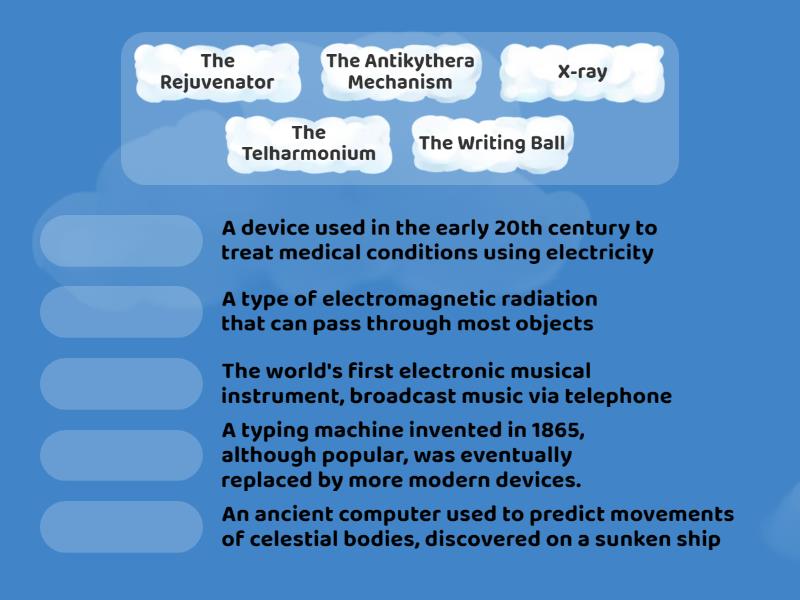 The Telharmonium - The world's first electronic musical instrument, broadcast music via telephone, The Rejuvenator - A device used in the early 20th century to treat medical conditions using electricity, The Writing Ball - A typing machine invented in 1865, although popular, was eventually replaced by more modern devices., The Antikythera Mechanism - An ancient computer used to predict movements of celestial bodies, discovered on a sunken ship, X-ray - A type of electromagnetic radiation that can pass through most objects,