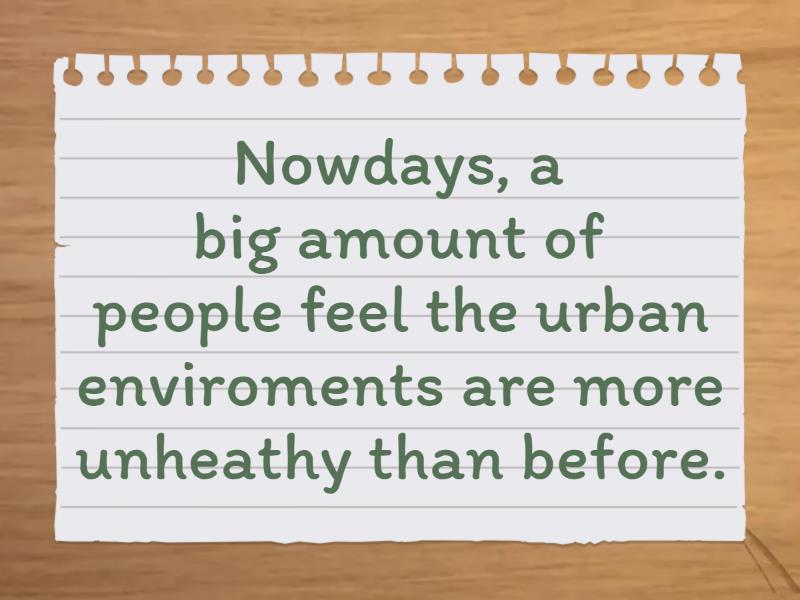 Nowdays, a big amount of people feel the urban enviroments are more unheathy than before. - Nowadays, many people hold the belief that urban environments are less healthy than they used to be., It is widely argued that someone who living in the urban environments is possibly get a worse healthy condition compared to the others who don't live in the same place. - It is widely felt that someone who is living in an urban environment may experience worse health conditions compared to someone who does not., Considering the increasing of cities, a considerable portion of the society believes that... - Considering the (expansion of and) increase in the number of cities, a significant proportion of society believe that..., Intro= Paraphrase + ______?_________ - Intro= Paraphrase + Thesis: This essay will describe the major cause of this issue, overpopulation, and suggest a possible solution., ...we need to try to work on reducing pollution in our planet, otherwise we won't have a healthy place to wher to life. - ..., and we need to work on reducing pollution on our planet; otherwise, we will not have a healthy place to live., But one that stands out from the rest and it's not good is, the unhealthy state of urban environments. - However, one serious issue that stands out from the rest is the unhealthy state of urban environments., Full-filled transportation by people makes people very annoying Generally, people go to their school or job at the same time There is the most crowded time. - Generally, people go to school or work at the same time, which is the most crowded time. As a result, overcrowded transportation can make people very annoyed. , BODY 1 Topic Sentence: Lately, technology has been one of the most relevant development around the world giving some advantages and disadvantages to society. - The examiner thinks- "Is this essay question about the advantages and disadvantages of technology in society?" Examiners will skim an IELTS essay to see if there is a thesis and relevant topic sentences for each paragraph, relating to the task. A suitable option may be: "To begin with, one major cause of the unhealthy state of urban areas is________.", In conclusion, the destruction is not easily to recover despite the fact that there are among of people tried to do something helpful for the environment.. - Despite the fact many people try to do something helpful for the environment, destruction is not easy to recover from., which leads to..., and large amount of enormous building all over the city which makes us feel less relieved and nervous. - This point is easy to knock down. Try: which leads to..., and numerous tall buildings all over cities, which could make us feel closed in or suffocated.,