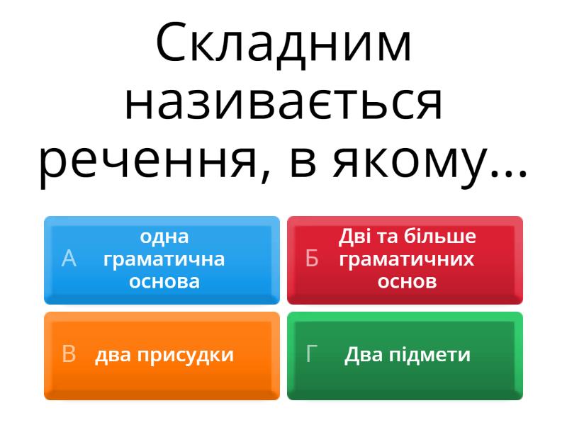 1) Складним називається речення, в якому... a) одна граматична основа b) Дві та більше граматичних основ c) два присудки d) Два підмети 2) Прості речення у складному з'єднуються? a) Комою b) Інтонацією c) тире, комою d) Сполучником та безсполучниковим зв'язком 3) Знайдіть складне речення a) Цвіркун сюрчить, і сад шумить b) Тут мене з дитинства пам'ятають і стрічають радо земляки c) Тимко взяв косу і хотів шаркнути нею по траві