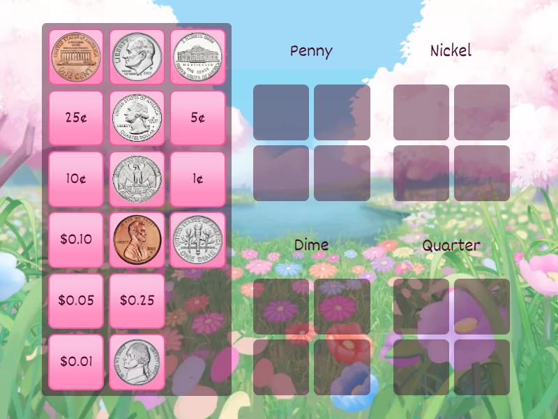 Penny: , , 1¢, $0.01, Nickel: , , 5¢, $0.05, Dime: , , 10¢, $0.10, Quarter: , , 25¢, $0.25,