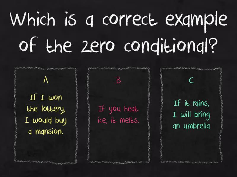 1) Which is a correct example of the zero conditional? a) If it rains, I will bring an umbrella b) If you heat ice, it melts. c) If I won the lottery, I would buy a mansion. 2) What linking word is used to introduce the main clause in a zero conditional? a) Since b) Although c) Then 3) What tense is used in the main clause of the zero conditional? a) Present perfect b) Future simple c) Present simple 4) What is the structure of the zero conditional? a) If + simple past, will + base form b) If + present simple, present simple c) If + past perfect, would + base form 5) What is the main purpose of the zero conditional? a) To talk about hypothetical situations in the present or general truths b) To talk about conditional future situations c) To express wishes or unreal conditions in the present