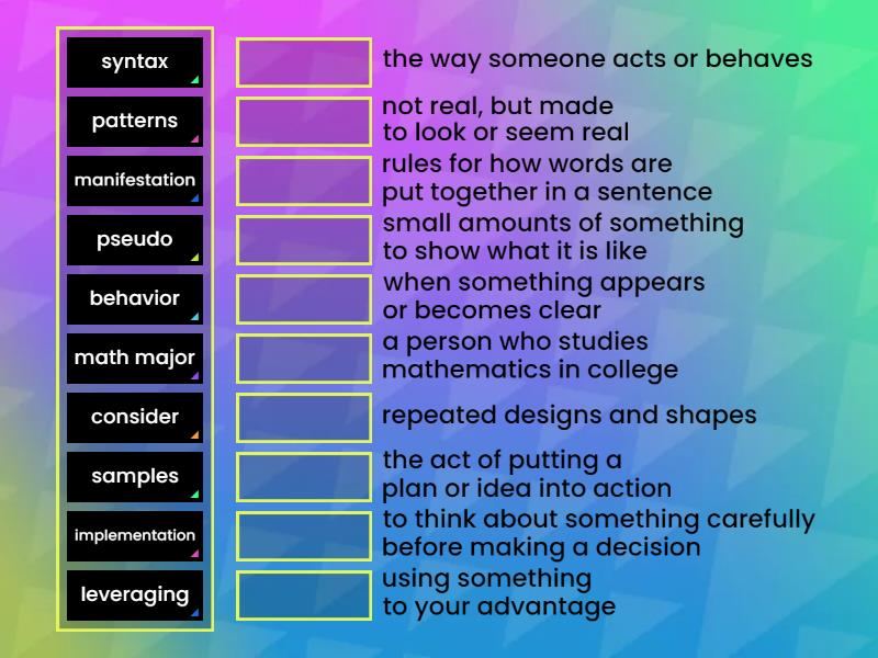 math major - a person who studies mathematics in college , leveraging - using something to your advantage , samples - small amounts of something to show what it is like , patterns - repeated designs and shapes , consider - to think about something carefully before making a decision , manifestation - when something appears or becomes clear, implementation - the act of putting a plan or idea into action , pseudo - not real, but made to look or seem real, syntax - rules for how words are put together in a sentence , behavior - the way someone acts or behaves ,