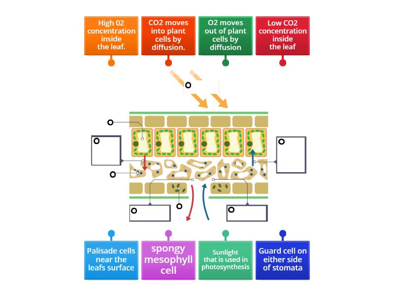 Palisade cells near the leafs surface, Low CO2 concentration inside the leaf, High 02 concentration inside the leaf., O2 moves out of plant cells by diffusion, spongy mesophyll cell, Guard cell on either side of stomata, Sunlight that is used in photosynthesis, CO2 moves into plant cells by diffusion..
