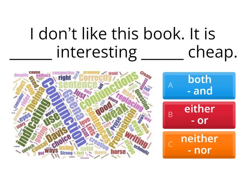 1) I don’t like this book. It is ______ interesting ______ cheap. a) both - and b) either - or c) neither - nor 2) Neither Linda nor I _____ classical music. a) liking b) don't like c) like 3) The baby is only two months old. He can ____ speak ____walk. a) neither - nor b) either - or c) both - and 4) He is _______ a teacher or a doctor. a) neither b) both c) either 5) She is ______friendly _____intelligent so I can’t help admiring her. a) neither - nor b) either - or c) both - and 6) John is very poor. He has ______ house ______ money. a) both - and b) either - or c) neither - nor 7) ______ Linh ______ her sister like listening to pop music. a) Both - and b) Either - or c) Neither - and 8) Neither my friend nor I _____ that movie. a) don't like b) like c) doesn't like 9) ___ Linda ___ Helen called to say sorry. I'm very sad and disappointed. a) Both - and b) Either - or c) Neither - nor 10) ___ Ryan ___ Susie have disappointed me. They didn't come to my birthday party. a) Both - and b) Either - or c) Neither - nor 11) He hurt ___ her feelings ___ her dignity. This is unforgivable. a) both - and b) either - or c) neither - nor 12) ___ loyalty ___ honesty are essential in a friendship. a) Both - and b) Either - or c) Neither - nor 13) You should ___ disrespect ___ deceive your friends. a) both - and b) either - or c) neither - nor 14) I will take you ___ to the cinema ___ to the theatre. That's a promise. a) both - and b) either - and c) neither - nor 15) Neither my brother ________________ my mother knows about this. a) and b) nor c) or 16) I felt ________________ happy and sad at the same time. a) both b) neither c) either 17) ________________ of the girls know how to dance. (= Both girls are bad dancers) a) both b) either c) neither 18) He ________________ has a cat or a dog. I can't remember. a) both b) either c) neither 19) I'm thinking of traveling to either Argentina ________________ Brazil. a) or b) and c) nor 20) I left it ____ on the table ____ in the drawer. a) either - nor b) neither - or c) either - or
