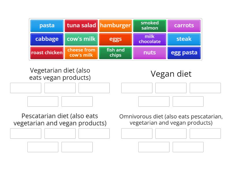 Vegetarian diet (also eats vegan products): cheese from cow’s milk, milk chocolate, eggs, egg pasta, cow’s milk, Vegan diet : nuts, pasta, cabbage, carrots, Pescatarian diet (also eats vegetarian and vegan products): tuna salad, smoked salmon, fish and chips, Omnivorous diet (also eats pescatarian, vegetarian and vegan products): steak, hamburger, roast chicken,