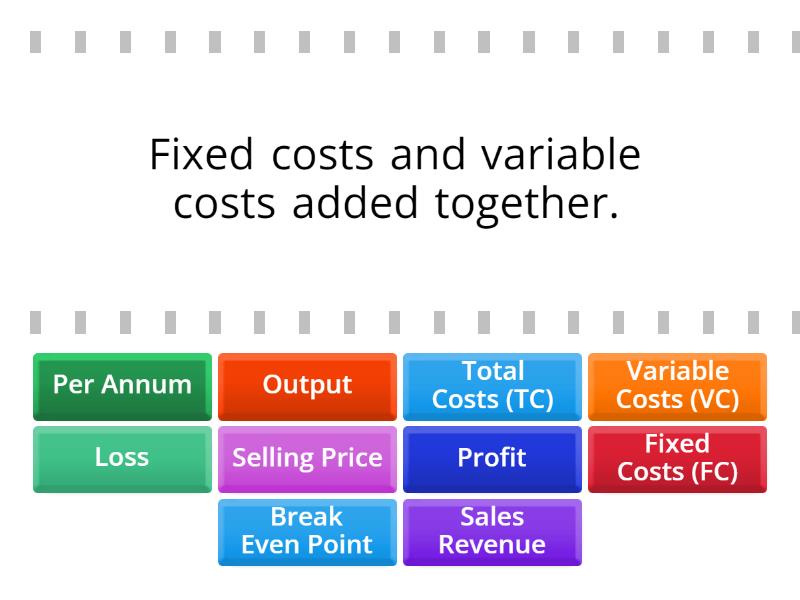 Total Costs (TC) - Fixed costs and variable costs added together., Fixed Costs (FC) - Costs that stay the same regardless of production or sales levels., Variable Costs (VC) - Costs which change in direct proportion (by the same amount) with any changes in production or sales., Per Annum - Each year, Selling Price - The amount of money a customer is charged for the good/service., Profit - Where sales revenue (money coming into the business from sales) is higher than the total costs being paid out., Loss - When sales revenue (the money coming into the business from sales) is lower than the total costs incurred by the business., Output - The number of goods being produced, Sales Revenue - Money coming into the business directly from selling goods/services., Break Even Point - The output level at which the sales revenue=total costs meaning no profit or loss is being made.,