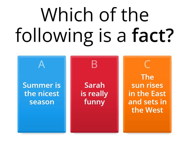 1)  Which of the following is a fact? a) Summer is the nicest season b) Sarah is really funny c) The sun rises in the East and sets in the West 2) Which of the following is an opinion? a) Rachel has three brothers b) Puppies are cuter than kittens c) My birthday is October 26th 3) An informative paragraph should have _____) a) facts b) opinion 4) Why do people read informative paragraphs? a) to laugh b) to be persuaded c) to learn something 5) Which of the following is like the title of an informational story? a) topic b) main idea c) details 6) What is the topic of our writing? a) Tsunamis b) storms c) weather 7) The main idea is ______ a) Evidence b) What the story is called c) The most important idea in the paragraph 8) Details.... a) support the main idea b) tell jokes c) are like the title 9) the details in an informational paragraph are... a) ideas b) facts and evidence c) opinions 10) How do we find evidence a) take a guess b) think of our opinions c) research