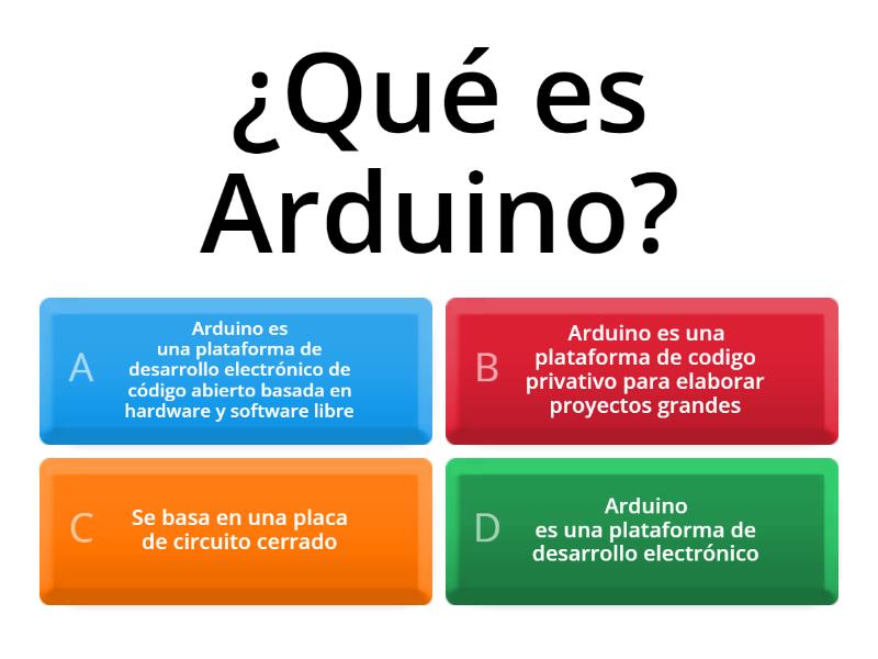1) ¿Qué es Arduino? a) Arduino es una plataforma de desarrollo electrónico de código abierto basada en hardware y software libre b) Arduino es una plataforma de codigo privativo para elaborar proyectos grandes c) Se basa en una placa de circuito cerrado d) Arduino es una plataforma de desarrollo electrónico 2) ¿Cuáles son las partes principales de una placa Arduino? a) Microcontrolador b) Microcontrolador, Pines de entrada/salida, Puerto USB c) Puerto USB, Microcontrolador d) Pines de entrada/salida, Puerto USB 3) ¿Qué son las salidas digitales en Arduino? a) Las salidas digitales son pines que se conectan a una entrada analogica b) Son pines que se asocian a los agujeros de la protoboard c) Son salidas digitales que se utilizan para programar circuitos electronicos d) Las salidas digitales son pines de la placa Arduino que pueden proporcionar dos estados de voltaje: alto (5V) o bajo (0V) 4) Para que se utilizan las salidas digitales en arduino a) Se utilizan para controlar LEDs, motores, relés y otros componentes digitales. b) Se utilizan para controlar componentes electronicos. c) Para controlar fuentes de alimentacion d) Se controlan solo el apagado de LEDs, motores, reles. 5) Dentro del IDE de arduino ¿Donde se configura un pin como salida? a) void loop() b) Void Setup() c) void setup() d) Void Loop() 6) ¿Qué es la función "delay" en Arduino? a) Permite esperar un tiempo determinado antes de continuar con la ejecución del código b) Permite configurar un pin de salida c) Se utiliza para controlar la salida digital d) Sirve para escribir una entrada digital 7) La siguiente linea de codigo se coloca dentro de la funcion "digitalWrite(7, HIGH);" a) Void loop() b) pinMode() c) void setup() d) void loop() 8) ¿Como se configura un pin como salida? a) pinMode(7, OUTPUT); b) DigitalWrite(7, HIGH); c) pinmode(7, OUTPUT); d) digitalWrite(7, HIGH);