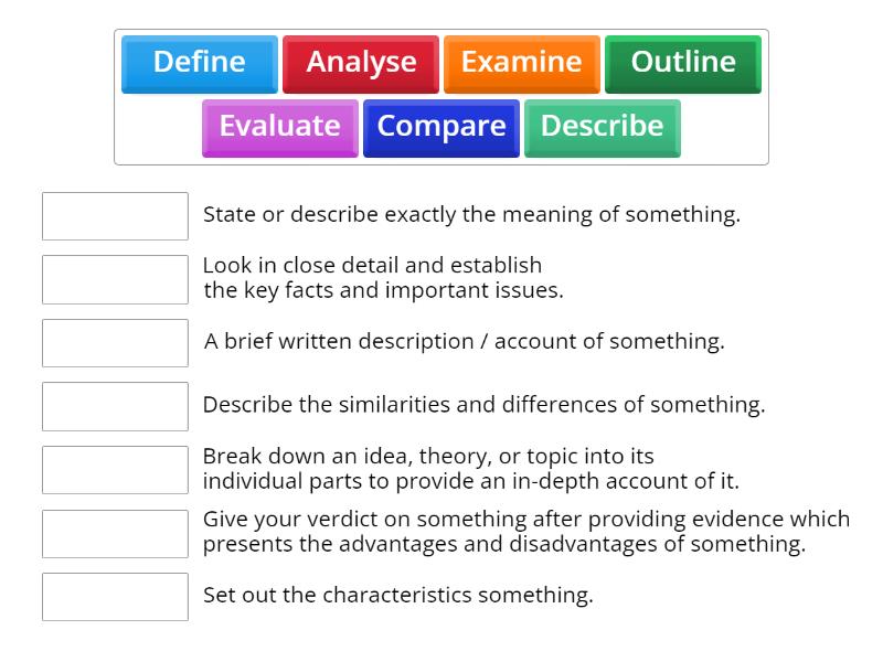 Compare - Describe the similarities and differences of something., Define - State or describe exactly the meaning of something., Describe - Set out the characteristics something., Evaluate - Give your verdict on something after providing evidence which presents the advantages and disadvantages of something., Examine - Look in close detail and establish the key facts and important issues., Outline - A brief written description / account of something., Analyse  - Break down an idea, theory, or topic into its individual parts to provide an in-depth account of it.,