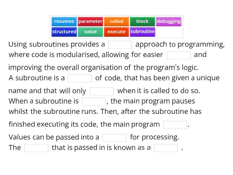 Using subroutines provides a ____ approach to programming, where code is modularised, allowing for easier ____ and improving the overall organisation of the program’s logic. A subroutine is a ____ of code, that has been given a unique name and that will only ____ when it is called to do so. When a subroutine is ____, the main program pauses whilst the subroutine runs. Then, after the subroutine has finished executing its code, the main program ____. Values can be passed into a ____ for processing. The ____ that is passed in is known as a ____ .