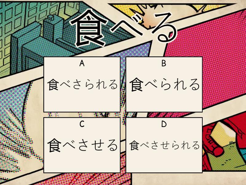 1) 食べる a) 食べられる b) 食べさられる c) 食べさせる d) 食べさせられる 2) 飲む a) 飲まされる b) 飲まさられる c) 飲まさせる d) 飲まれる 3) あらう a) あらわれる b) あらわされる c) あらわせる d) あらわさせられる 4) 答える a) 答わせる b) 答わせられる c) 答えさせられる d) 答させられる 5) がっかりする a) がっかりさせられる b) がっかりさせる c) がっかりされる d) がっかりさされる 6) おなかをこわす a) おなかをこわさせられる b) おなかをこわさせる c) おなかをこわされる d) おなかをこわさされる 7) 言う a) 言わされる b) 言われる c) 言わせる d) 言わさせる 8) 立つ a) 立たれる b) 立たせる c) 立たされる d) 立たさせる 9) 読む a) 読ませる b) 読まれる c) 読まされる d) 読まさられる 10) コピーをとる a) コピーをとらさせる b) コピーをとらされる c) コピーをとらせる d) コピーをとられる 11) むかえにくる a) むかえにこさせられる b) むかえにこさせる c) むかえにこられる d) むかえにこらされる 12) むかえに行く a) むかえに行かされる b) むかえに行かせる c) むかえに行かれる d) むかえに行かれせる