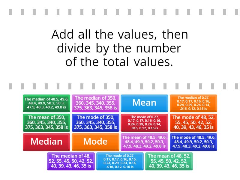 Mean - Add all the values, then divide by the number of the total values., Median - The middle two values if the number of values are even. Select the number that is repeated most often., Mode - The number that is repeated most often., The mean of 350, 360, 345, 340, 355, 375, 363, 345, 358 is - 354.5, The median of 350, 360, 345, 340, 355, 375, 363, 345, 358 is - 355, The mode of 350, 360, 345, 340, 355, 375, 363, 345, 358 is - 345, The mean of 48, 52, 55, 45, 50, 42, 52, 40, 39, 43, 46, 35 is - 45.6, The mode of 48, 52, 55, 45, 50, 42, 52, 40, 39, 43, 46, 35 is - 52, The median of 48, 52, 55, 45, 50, 42, 52, 40, 39, 43, 46, 35 is - 45.5, The mode of 0.27, 0.17, 0.17, 0.16, 0.16, 0.24, 0.29, 0.24, 0.14, .016, 0.12, 0.16 is - 0.16, The mean of 0.27, 0.17, 0.17, 0.16, 0.16, 0.24, 0.29, 0.24, 0.14, .016, 0.12, 0.16 is - 0.178, The median of 0.27, 0.17, 0.17, 0.16, 0.16, 0.24, 0.29, 0.24, 0.14, .016, 0.12, 0.16 is - 0.165, The median of 48.5, 49.6, 48.4, 49.9, 50.2, 50.3, 47.9, 48.3, 49.2, 49.8 is - 49.4, The mean of 48.5, 49.6, 48.4, 49.9, 50.2, 50.3, 47.9, 48.3, 49.2, 49.8 is - 49.2, The mode of 48.5, 49.6, 48.4, 49.9, 50.2, 50.3, 47.9, 48.3, 49.2, 49.8 is - There is no mode.,