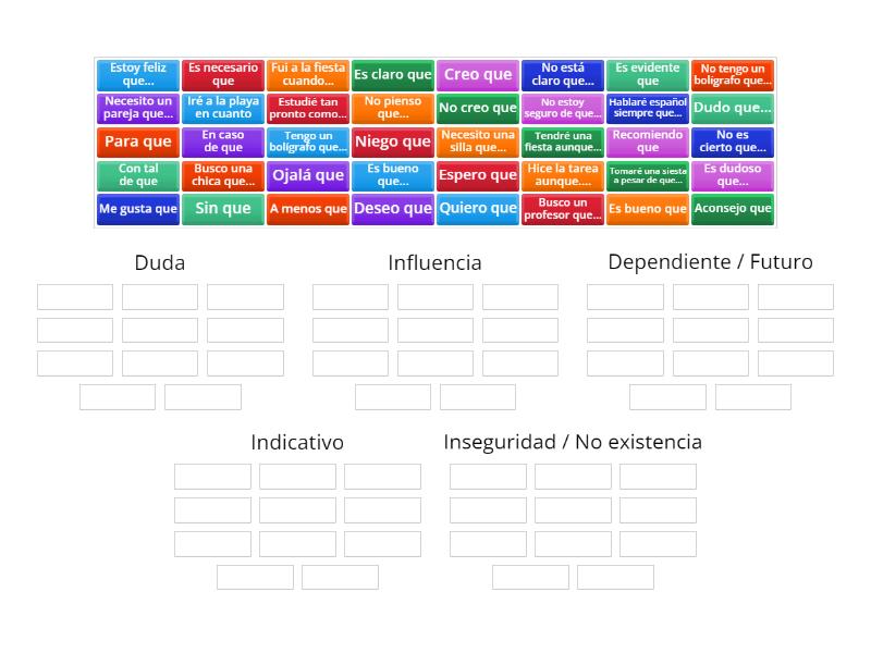 Duda: Dudo que..., Es dudoso que..., No está claro que..., Niego que, No es cierto que..., No pienso que..., No creo que, No estoy seguro de que..., Influencia: Deseo que, Aconsejo que, Es bueno que, Es necesario que, Espero que, Ojalá que, Me gusta que, Quiero que, Recomiendo que, Es bueno que..., Estoy feliz que..., Dependiente / Futuro: Para que, A menos que, Con tal de que, En caso de que, Sin que, Iré a la playa en cuanto, Tomaré una siesta a pesar de que..., Hablaré español siempre que..., Tendré una fiesta aunque..., Indicativo: Creo que, Es claro que, Es evidente que, Tengo un bolígrafo que..., Necesito una silla que..., Fui a la fiesta cuando..., Estudié tan pronto como..., Hice la tarea aunque...., Inseguridad / No existencia: Busco una chica que..., Necesito un pareja que..., No tengo un bolígrafo que..., Busco un profesor que...,