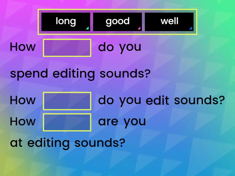 How ____ do you spend editing sounds? How ____ do you edit sounds? How ____ are you at editing sounds? How ____ do you cook? How ____ do you spend cooking? How ____ are you at cooking? How ____ do you dance? How ____ do you spend singing? How ____ are you at singing? How ____ do you paint? How ____ do you spend dancing? How ____ do you dance? How ____ are you at playing an instrument? How ____ do you create poems?