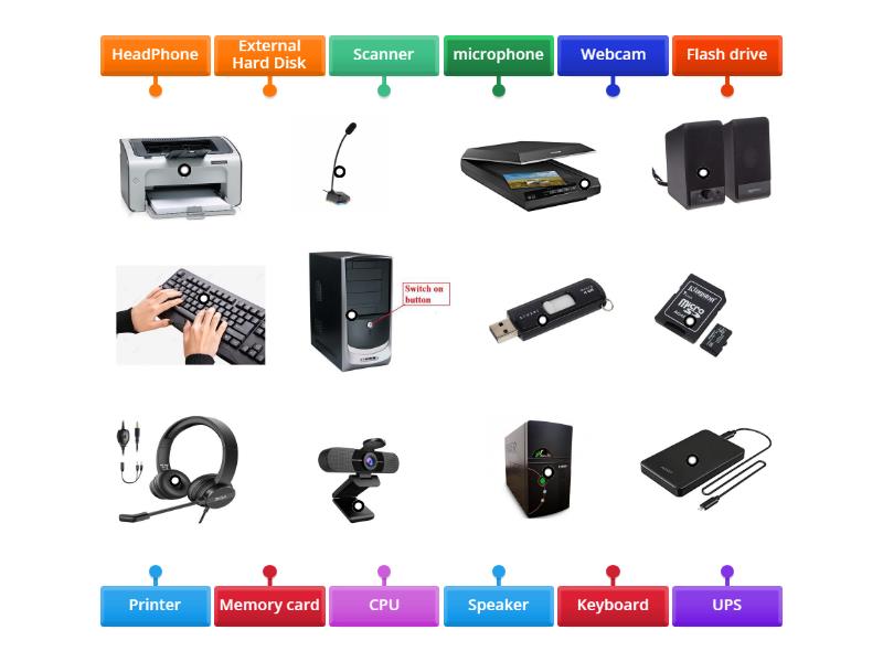 Printer, Keyboard, HeadPhone, microphone, CPU, Webcam, Scanner, Flash drive, UPS, Speaker, Memory card, External Hard Disk.