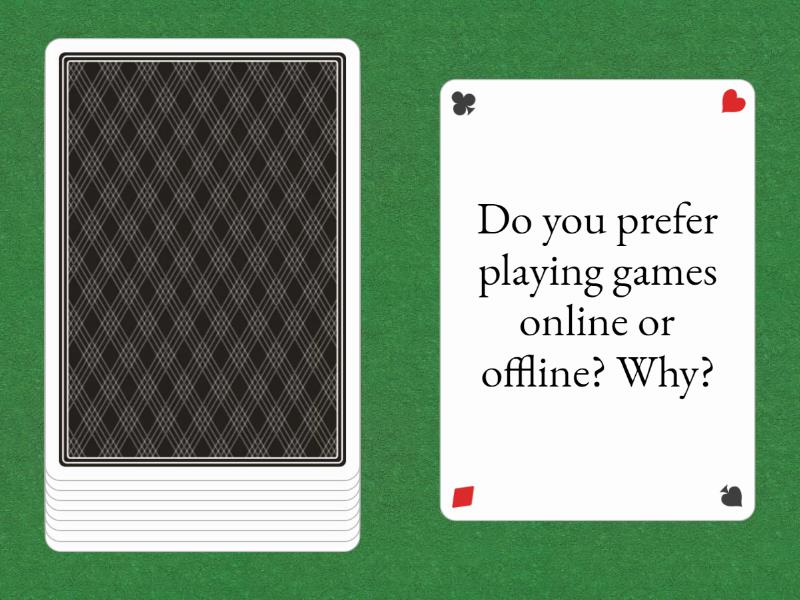 : Do you play computer/video games?, What are your favorite kind of games?, Which games can't you stand at all?, How often do you play games? , Who do you play games with?, Do you prefer playing games online or offline? Why?, What do you think is the best thing about computer games?, What is one thing you don't like about some computer games?, Do you think it's important to take breaks when playing games? Why or why not?,