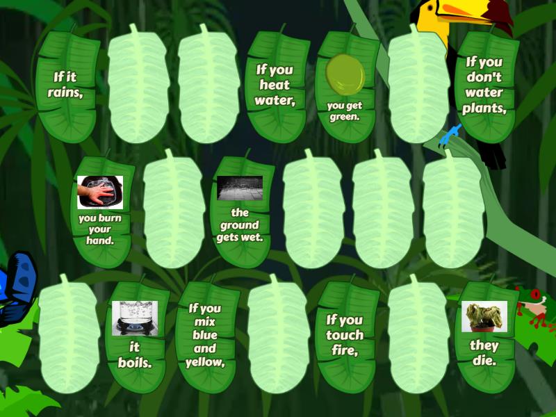 If you heat water, - it boils., If you mix blue and yellow, - you get green., If you don't water plants, - they die., If you touch fire, - you burn your hand., If it rains, - the ground gets wet., If the sun shines, - the day is warm., If you drop glass, - it breaks., If you don't eat, - you get hungry., If you press the button, - the light turns on., If you read a lot, - you learn new things.,