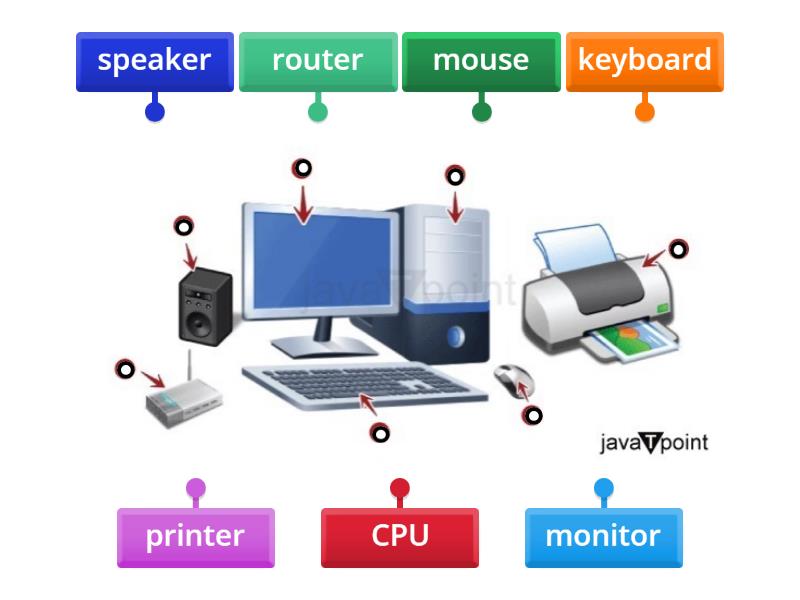 monitor, CPU, keyboard, mouse, printer, speaker, router.