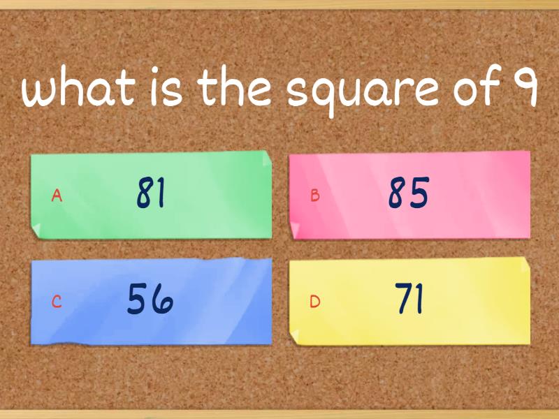 1) what is the square of 9 a) 81 b) 85 c) 56 d) 71