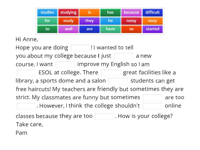 Hi Anne, Hope you are doing ____! I wanted to tell you about my college because I just ____ a new course. I want ____ improve my English so I am ____ ESOL at college. There ____ great facilities like a library, a sports dome and a salon ____ students can get free haircuts! My teachers are friendly but sometimes they are strict. My classmates are funny but sometimes ____ are too ____. However, I think the college shouldn’t ____ online classes because they are too ____. How is your college? Take care, Pam