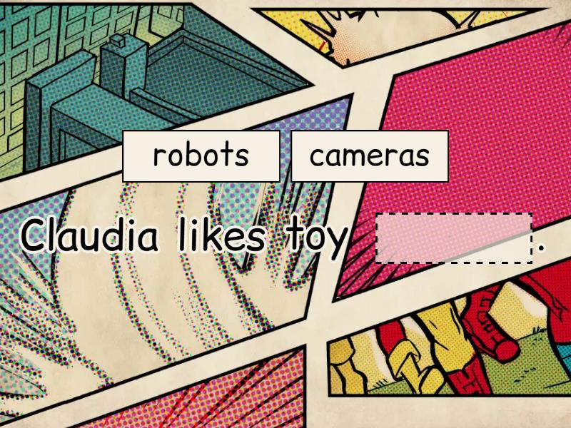 Claudia likes toy ____. The robot in the small photo is ____. Zoomer is a(n) ____ robot. Robby and Zoomer can ____. You can ____ Claudia's toys.