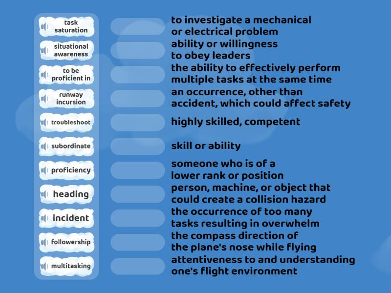 followership - ability or willingness to obey leaders, heading - the compass direction of the plane's nose while flying, incident - an occurrence, other than accident, which could affect safety, multitasking - the ability to effectively perform multiple tasks at the same time, proficiency - skill or ability, to be proficient in - highly skilled, competent, runway incursion - person, machine, or object that could create a collision hazard, situational awareness - attentiveness to and understanding one's flight environment, subordinate - someone who is of a lower rank or position, task saturation - the occurrence of too many tasks resulting in overwhelm, troubleshoot - to investigate a mechanical or electrical problem,