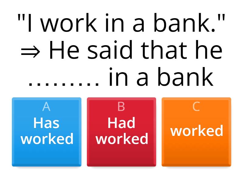 1) "I work in a bank." ⇒ He said that he ……… in a bank a) Has worked b) Had worked c) worked 2) 'I am working today.' ⇒ She told us she ............... that day. a) is working b) was working c) worked 3) " I've been ill for a couple of weeks." ⇒ He told me he ………… for a couple of weeks. a) had been ill b) is ill c) was ill 4) 'I was at the doctor all morning.' ⇒ She told me that she ............... at the doctor all morning. a) had been b) would been c) has been 5) 'I'll lend you the money.' ⇒ He told me he .................. me the money. a) lent b) was lending c) would lend 6) 'I can't do it without your help.' ⇒ She said she ................. it without my help. a) hadn't do b) couldn't do c) didn't do 7) 'The meeting may start early.' ⇒ He told us that the meeting ................ early. a) might start b) would start c) can sart 8) 'I need to see Sarah this weekend.' ⇒ George said that ______. a) he needed to see Sarah this weekend b) he was needing to see Sarah that weekend c) he needed to see Sarah that weekend 9) 'I haven't seen Barbara since last year.' ⇒ Brendan told me ______. a) he didn't see Barbara since last year b) he hadn't seen Barbara since last year c) he hadn't seen Barbara since the year before 10) 'I'm really tired' ⇒ She said that she _____ really tired. a) is b) was c) were 11) 'I don't want any trouble.' ⇒ He told me he _____ any trouble. a) didn't want b) hadn't want c) hasn't want 12) 'I love my family.' ⇒ He told me that _____ loved _____ family. a) I-My b) You-your c) he-his 13) 'I haven't seen Tom.' ⇒ She told me she _____ Tom. a) hadn't seen b) haven't seen c) didn't see 14) "We went to cinema yesterday". They said ...... a) They had gone to cinema yesterday. b) they went to the cinema the day before c) They had been to the cinema the day before. 15) They had never been to Scotland until last year. They said they ...... a) had never been to Scotland until last year. b) have never been to Scotland until the previous year c) had never been to Scotland until the previous year 16) 'You have my phone.' ⇒ The man said that _____ had _____ phone. a) you-his b) I-your c) I-his 17) 'I'm trying to concentrate.' ⇒ She said that she _____ to concentrate. a) was triying b) tried c) tries 18) 'I didn't steal any money.' ⇒ The thief said that he _____ any money. a) hasn't stolen b) didn't steal c) hadn't stolen 19) 'I won't call you again.' ⇒ She told me she _____ again. a) wouldn't call me b) wouldn't call you c) didn't call me 20) “I’m very busy today.” He said ___ . a) he is very busy today b) he was very busy that day c) I’m very busy today 21) Lena said, “Where have you been yesterday?” Lena asked ___ . a) where she had been the day before. b) where she had been yesterday. c) where she was the day before. 22) "I will be there by noon." a) He said he would be there by midnight. b) He said he will be there by midnight. c) He said he was there by midnight. 23) My aunt said, "I am leaving early on Friday morning." She said she ........ a) was leaving b) left c) were leaving 24) The twins said, "We are five years old." a) The twins said they were five years old. b) The twins said they are five years old. c) The twins say they were five years old. 25) The teacher told her, "You speak English very well."The teacher told her that she a) speaks English very well b) was speaking English very well c) spoke English very well 26) "I'm coming!" a) She said that she was coming b) she said that she came c) she said that she is coming 27) "I'm going to see the doctor tomorrow. He said that ......... a) he is going to see the doctor tomorrow b) he was going to see the doctor the following day c) he is going to see the doctor the day before 28) Jim said, "I hope it won't rain tomorrow." a) Jim said he hopes it won't rain tomorrow. b) Jim said he hoped it wouldn't rain the next day. c) Jim says he hopes it wouldn't rain tomorrow . 29) Herbert said, "We are going to live in Manchester." Herbert said that they a) lived in Manchester b) are going to live in Manchester c) were going to live in Manchester. 30) I told the gas man, "I have already paid the bill." a) I told the gas man I have already paid the bill. b) I told the gas man that I had already paid the bill. c) I told the gas man I already paid the bill.