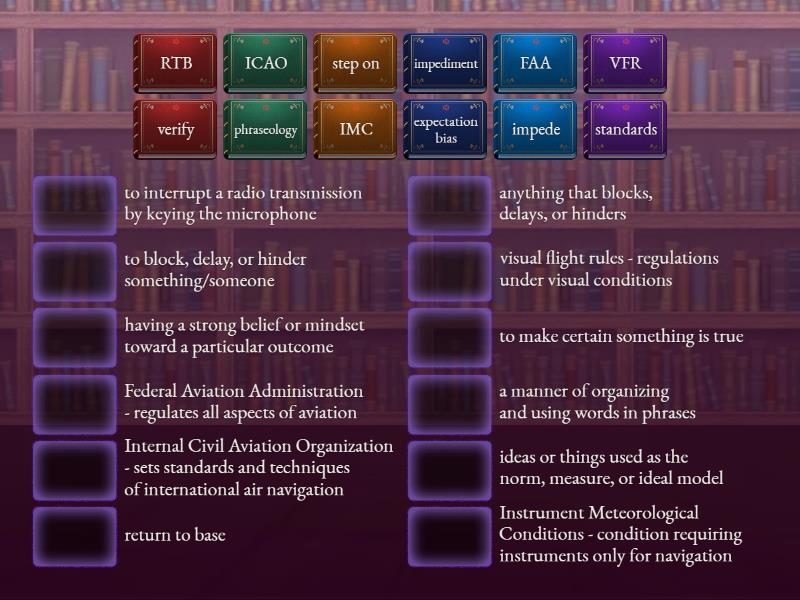 expectation bias - having a strong belief or mindset toward a particular outcome, FAA - Federal Aviation Administration - regulates all aspects of aviation, ICAO - Internal Civil Aviation Organization - sets standards and techniques of international air navigation, IMC - Instrument Meteorological Conditions - condition requiring instruments only for navigation, impede - to block, delay, or hinder something/someone, impediment - anything that blocks, delays, or hinders, phraseology - a manner of organizing and using words in phrases, RTB - return to base, standards - ideas or things used as the norm, measure, or ideal model, step on - to interrupt a radio transmission by keying the microphone, verify - to make certain something is true, VFR - visual flight rules - regulations under visual conditions,