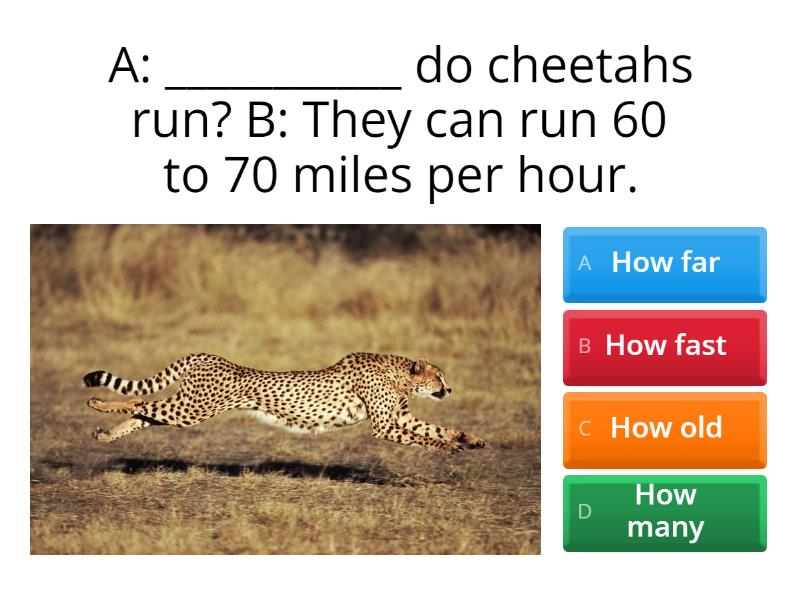 1) A: ___________ do cheetahs run? B: They can run 60 to 70 miles per hour. a) How far b) How fast c) How old d) How many 2) A: _________ is your mom? B: She is 90 years old. a) How fast b) How long c) How old d) How far 3) A: __________ friends do you have? B: I have a few. a) How much b) How many c) How old d) How far 4) _A: ________ is it from New York City to Los Angeles? B: By air, it typically takes around 5 to 6 hours.. a) How fast b) How old c) How far d) How often 5) A:  _________ did you pay for your house? B: Around $450,000 a) How many b) How fast c) How much d) How come 6) A: _______ you married? B: I loved her. a) How much b) How far c) How old d) How come 7) A: __________ does it take you to go from home to work? B: It takes me an hour. a) How far b) How many c) How old d) How long 8) A: ______ did you go out when you were young? B: I went out once a week. a) How come b) How many c) How often d) How well 9) A: _________ did the team work? B: They did an incredible job! a) How much b) How well c) How fast d) How far 10) A: _________ people did you invite to the club? B: About 10. a) How much b) How far c) How often d) How many 11) A: I didn't do well on my test. B: _________? We studied a lot. a) How fast b) How well c) How come d) How much 12) A: _________ were you when you went to Disney World? B: I think I was 11. a) How much b) How many c) How long d) How old 13) A: ________ can you cook dinner? B: It takes me about 45 minutes. a) How far b) How long c) How much d) How fast 14) A: _________ can you run? B: No more than 15 minutes. a) How many b) How much c) How fast d) How often 15) A: _________ do you clean your house? B: I usually clean my house twice a week. a) How often b) How many c) How old d) How well 16) A: _________ do you clean your house? B: I like to clean everything. I like my house to be spotless. a) How often b) How many c) How old d) How well 17) A: _______ do you plan to stay on vacation? B: Just two weeks. a) How far b) How many c) How come d) How long 18) A: _______ did you walk during your morning jog? B: I walked about 3 miles. a) How many b) How fast c) How far d) How well 19) A: __________ water do you drink a day? B: About 2 liters. a) How many b) How fast c) How much d) How often 20) A: ________ was Simon Bolivar when he died? B: He died at the age of 47. a) How much b) How many c) How come d) How old 21) A: __________ do you know your presentation? B: I know it by heart. a) How well b) How many c) How long d) How often 22) A: ________ countries are there in Africa? B: There are 54 countries in Africa. a) How much b) How many c) How long d) How far 23) A: _________ you didn't attend the meeting yesterday? B: I was sick. a) How much b) How many c) How well d) How come 24) A: _________ do you use your cellphones? B: A lot. We need cellphones for everything! a) How fast b) How old c) How much d) How far 25) A: __________ is your hair? A: My hair is about shoulder-length. a) How far b) How often c) How long d) How well
