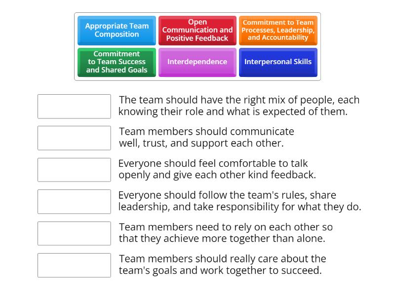 Commitment to Team Success and Shared Goals - Team members should really care about the team's goals and work together to succeed., Interdependence - Team members need to rely on each other so that they achieve more together than alone., Interpersonal Skills - Team members should communicate well, trust, and support each other., Open Communication and Positive Feedback - Everyone should feel comfortable to talk openly and give each other kind feedback., Appropriate Team Composition - The team should have the right mix of people, each knowing their role and what is expected of them., Commitment to Team Processes, Leadership, and Accountability - Everyone should follow the team's rules, share leadership, and take responsibility for what they do.,