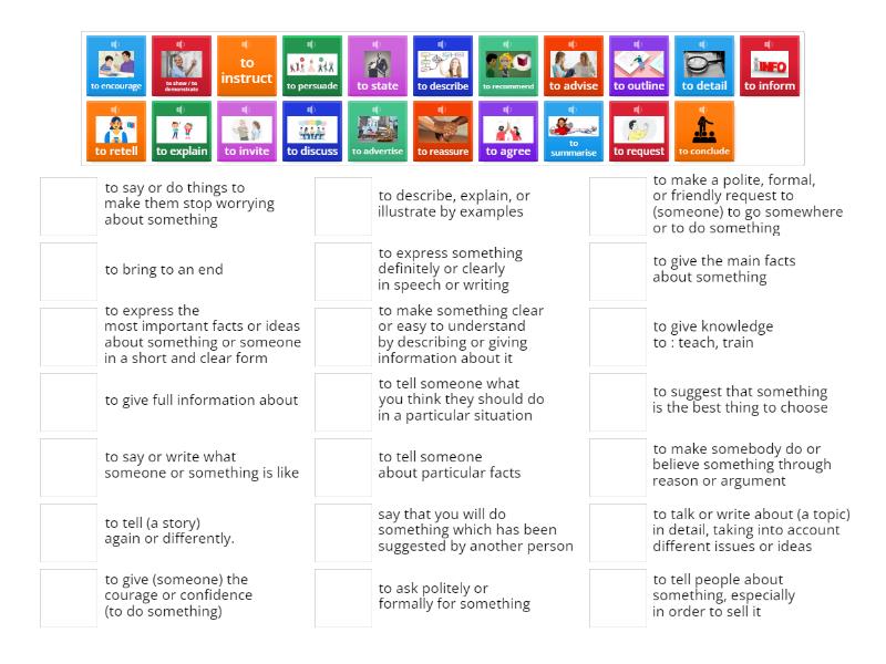 to state - to express something definitely or clearly in speech or writing, to reassure - to say or do things to make them stop worrying about something, to describe - to say or write what someone or something is like, to explain - to make something clear or easy to understand by describing or giving information about it, to summarise - to express the most important facts or ideas about something or someone in a short and clear form, to invite - to make a polite, formal, or friendly request to (someone) to go somewhere or to do something, to persuade - to make somebody do or believe something through reason or argument, to agree - say that you will do something which has been suggested by another person, to request - to ask politely or formally for something, to retell - to tell (a story) again or differently., to encourage - to give (someone) the courage or confidence (to do something), to recommend - to suggest that something is the best thing to choose, to discuss - to talk or write about (a topic) in detail, taking into account different issues or ideas, to outline - to give the main facts about something, to inform - to tell someone about particular facts, to detail - to give full information about, to conclude - to bring to an end , to advise - to tell someone what you think they should do in a particular situation, to advertise - to tell people about something, especially in order to sell it, to show / to demonstrate - to describe, explain, or illustrate by examples, to instruct - to give knowledge to : teach, train,