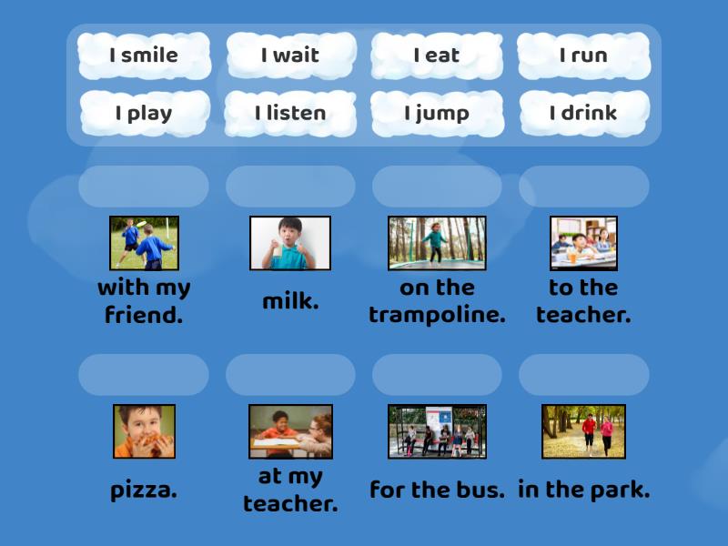 I drink - milk., I eat - pizza., I listen - to the teacher., I jump - on the trampoline., I smile - at my teacher., I wait - for the bus., I run - in the park., I play - with my friend.,