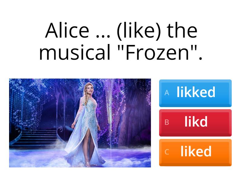 1) Alice ... (like) the musical "Frozen". a) likked b) likd c) liked 2) Jim ... (visit) his grandmother yesterday. a) visited b) visitted c) visitd 3) Molly ... (cry) two hours ago. a) cryed b) cred c) cried 4) He ... (slip) on the wet floor. a) sliped b) slipped c) slipied 5) The Smith family ... (live) in a beautiful house in 1976. a) liveed b) lived c) livied 6) They ... (enjoy) travelling a lot five years ago. a) enjoyed b) enjoied c) enjoed 7) Bob, Matt, and Sophie ... (watch) football last Monday. a) watchd b) watched c) watches 8) I ... (play) hockey yesterday. a) plaied b) playd c) played 9) Her car ... (stop) a minute ago. a) stoped b) stoppd c) stopped 10) Molly ... (study) hard for her exams yesterday. a) studied b) studed c) studyed