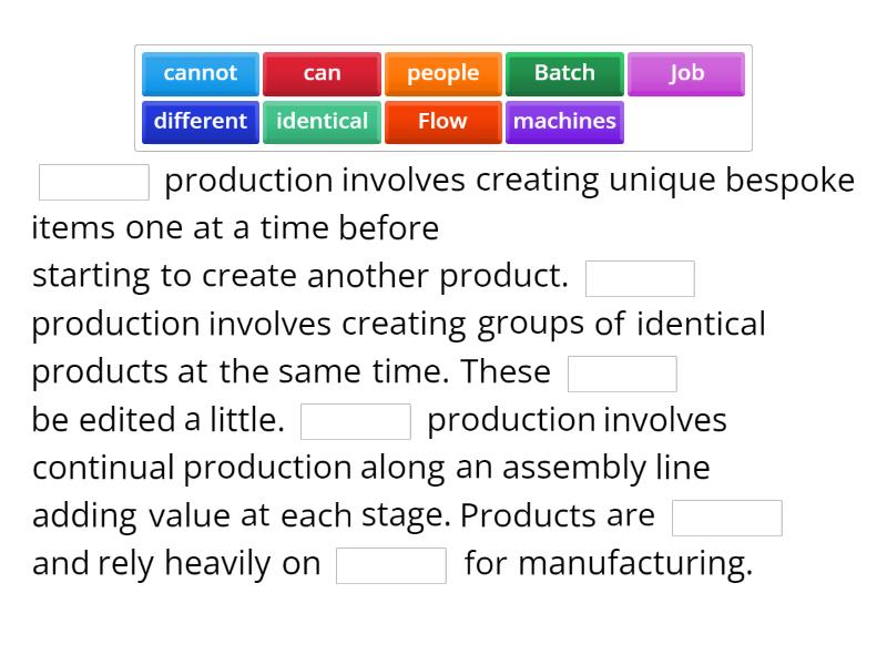 ____ production involves creating unique bespoke items one at a time before starting to create another product. ____ production involves creating groups of identical products at the same time. These ____ be edited a little. ____ production involves continual production along an assembly line adding value at each stage. Products are ____ and rely heavily on ____ for manufacturing.