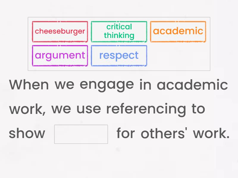 When we engage in academic work, we use referencing to show ____ for others' work. Look at the following excerpt which makes an argument based on the content on page 186 of John Jenkins' book, For the Love of Onions, and supply the correct in-text reference. ...one can clearly agree with Jenkins that any dish which has not started with onions fried in a pan can not be considered a meal ____ Complete the reference for a book by one author: Title: Wolf Hall Author: Hilary Mantel Publisher: Picador Year Published: 2010 ____ ____ ____ ____ Complete the reference for a painting viewed in a book: Painting Title: Self-Portrait Artist: Vincent van Gogh Title: Van Gogh in Arles Editors Ronald Pickvance and Harry N. Abrams Publisher: Metropolitan Museum of Art Year Published: 1984 ____ ____ ____ ____ ____ ____ ____ ____ Complete the reference for a painting viewed online: Title: The Train Artist: Romare Bearden Year Painted: 1975 Website Name: MOMA URL: www.moma.org/collection/works/65232?locale=en ____ ____ ____ ____ ____ Look at the following excerpt which makes an argument based on the content discussed in Dehlia Henno's book, South African Teas, and supply the correct in-text reference. ...it was discovered in her research that the unique flavours and qualities of Rooibos tea was preferred by all who had tasted it ____ You are directing your reader's attention to a table in your text. This is the first table in your writing. The correct name for the table would be ____. You are directing your reader's attention to a table in your text. This is the first table in your writing. Choose the best answer to complete the sentence below: The respondents in favour of chocolate were overwhelming, ____ Complete the reference for a movie viewed online: Movie: Sanctuary Year Released: 1961 Studio: Twentieth Century Fox Director: Tony Richardson Screenwriter: James Poe Viewed on: Youtube Channel: LostCinemaChannel Date watched: 17 July 2014 URL: www.youtube.com/watch?v=IMnzFM_Sq8s. ____ ____ ____ ____ ____ ____ ____ ____ ____ ____ You display an image in your text. This is the first time you use a image. Choose the best answer to complete the sentence below: When analysing the composition of the piece... ____ You display an image in your text. How should you reference your image? With the following: ____ ____ ____ ____ ____ ____ Complete the reference for an article on a website: Article: The Death of the Artist—and the Birth of the Creative Entrepreneur. Author: William Deresiewicz Website: The Atlantic Date of Publication: 28 Dec. 2014 URL: theatlantic.com/magazine/archive/2015/01/ the-death-of-the-artist-and-the-birth-of-thecreative-entrepreneur/383497/ ____ ____ ____ ____ ____