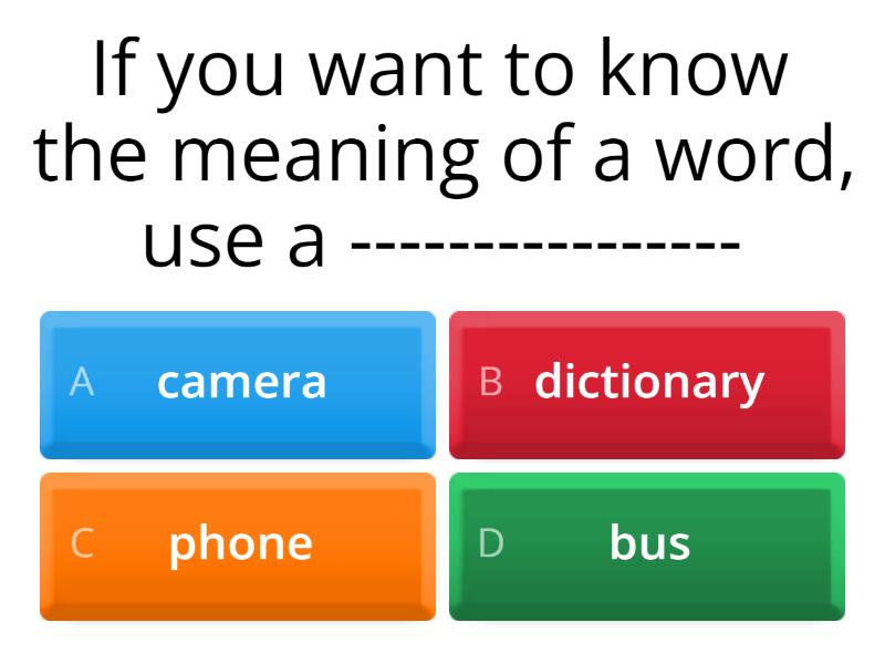 1) If you want to know the meaning of a word, use a ---------------- a) dictionary  b) phone c) camera d) bus 2) He is a ----------------.He has a lot of students in the classroom. a) doctor  b) teacher c) businessman d) nurse 3) Fatima is 11 years old. She is a ------------at school. a) doctor b) student c) nurse d) builder 4) A------works in a hospital. a) teacher b) student c) doctor d) builder 5) A------ helps doctors. a) bus driver b) student c) teacher d) nurse 6) What is her-----? She's a teacher.  a) name b) father c) job d) mother 7) Ahmed is a---------- officer. a) teacher b) doctor c) police d) nurse 8) A-----------teaches students at school. a) doctor b) student c) teacher  d) nurse 9) A bus -------- drives a bus. a) businessman b) doctor c) driver  d) nurse 10) -------build houses. a) Builders b) Doctors c) Teachers d) Nurses 11) Where ----- you from? a) are b) have c) is d) does 12) Farah is a doctor. She --------- a student. a) isn't b) don't c) aren't  d) not 13) Ahmed and Ali --------- police officer. They are businessmen. a) isn't  b) don't c) aren't d) not 14) -----------are you doing. I'm reading a book. a) Why b) Where c) When d) What 15) Tourist: Excuse me! ----------------- Man: It's over there. a) What is your name ? b) Where are you from? c) How are you? d) Where is the station? 16) Karin: Have a nice holiday. Huda :-------------- a) I'm sorry b) Good Morning c) Thank you d) Where's the town centre? 17) Where -------she live? a) does b) are c) do d) not 18) Heba: How are you? Fatima:------------- a) I'm sorry b) Thank you c) Fine. And you? d) Thanks 19) Ali: A coffee, please. Waiter: --------------------- a) That's £ 1.20. b) come now c) I don't know. d) thank you 20) Heba and Fatima are my friends.  ----------are very nice. a) You b) He c) They d) She