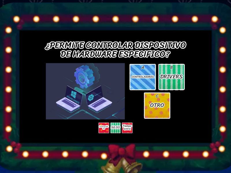 1) ¿PERMITE CONTROLAR DISPOSITIVO DE HARDWARE ESPECIFICO? a) CONTROLADORES b) DRIVERS c) OTRO 2) CONJUNTO DE DATOS ALMACENADOS a) ARCHIVO b) CONECTORES c) BITACORA 3) DATOS INFORMATICOS, QUE REALIZAN TAREAS ESPECIFICAS a) PROGRAMAS b) SOFTWARE c) HARDWARE 4) TAMBIEN CONOCIDOS COMO "FUENTE DE ALIMENTACION" a) FUENTESS EXTERNAS b) FUENTE DE PODER c) FUENTES 5) UNIDAD CENTRAL DE PROCESAMIENTO a) PROCESADOR b) MICROPROCESADOR c) UNIDAD DE PROCESAMIENTO 6) TAMBIEN CONOCIDA COMO MODULO DE MEMORIA a) TARJETA RAM b) MODULO RAM c) MEMORIA 7) ALMACENAMIENTO DE DATOS NOVATILES a) DISCO b) HDD c) DISCO DURO 8) CODIGO BINARIO QUE REPRESENTA INFORMACION a) TB b) BIT c) CALCULOS 9) MAQUINA ELECTRONICA QUE PROCESA, ALMACEENA Y MANIPULA a) CPU b) SOFTWARE Y HARDWARE c) COMPUTADORA 10) REPRESENTACION GRAFICA DE INFORMACION a) DESCRIPCION TEXTUAL b) DIAGRAMA c) CONCEPTOS