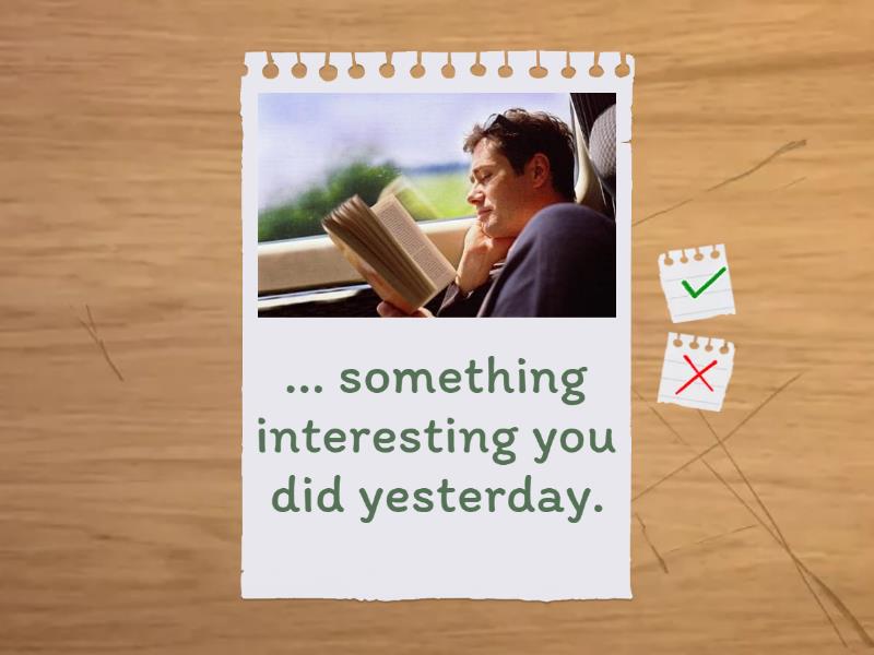... somewhere you went last weekend. , ... something important you forgot to do last week. , ... the last thing you sent by post. , ... an interesting photo you took last summer. , ... something you bought last week. , ... something interesting you did yesterday. , ... something you had and liked when you were younger but you haven't got now. , ... a present you gave to a friend/significant other/relative for his/her birthday. , ... a present someone gave you for your birthday. ,