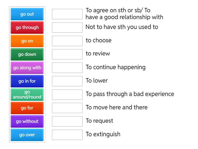 go through - To pass through a bad experience, go in for - To request, go without - Not to have sth you used to , go out - To extinguish, go for - to choose, go on - To continue happening , go along with - To agree on sth or sb/ To have a good relationship with, go down - To lower, go over - to review, go around/round - To move here and there,