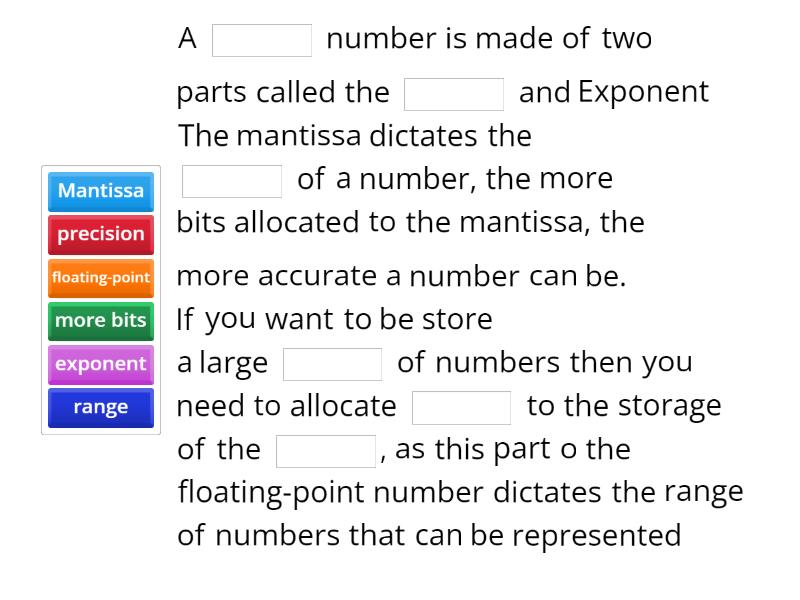 A ____ number is made of two parts called the ____ and Exponent The mantissa dictates the ____ of a number, the more bits allocated to the mantissa, the more accurate a number can be. If you want to be store a large ____ of numbers then you need to allocate ____ to the storage of the ____, as this part o the floating-point number dictates the range of numbers that can be represented