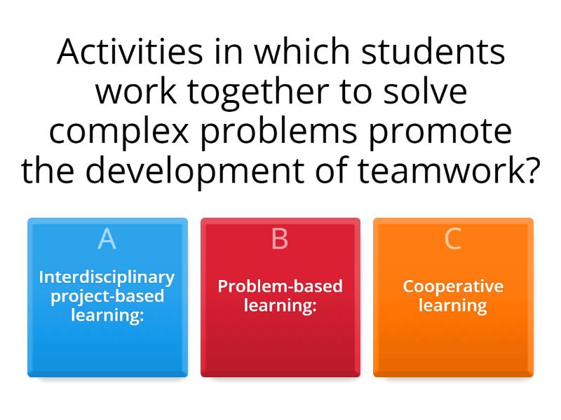 1) Activities in which students work together to solve complex problems promote the development of teamwork? a) Interdisciplinary project-based learning: b) Problem-based learning: c) Cooperative learning