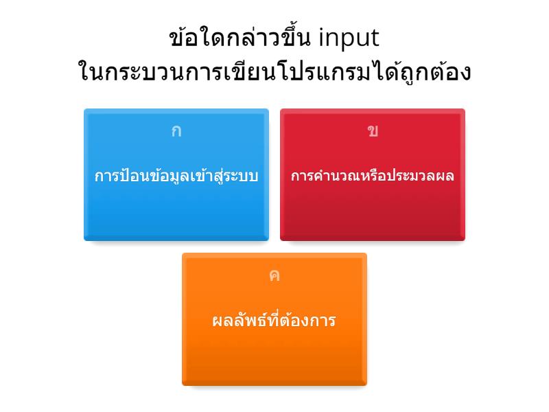 1) ข้อใดกล่าวขึ้น input ในกระบวนการเขียนโปรแกรมได้ถูกต้อง a) การป้อนข้อมูลเข้าสู่ระบบ b) การคำนวณหรือประมวลผล c) ผลลัพธ์ที่ต้องการ 2) ข้อใดกล่าวขึ้น process ในกระบวนการเขียนโปรแกรมได้ถูกต้อง a) การป้อนข้อมูลเข้าสู่ระบบ b) การคำนวณหรือประมวลผล c) ผลลัพธ์ที่ต้องการ 3) ข้อใดกล่าวขึ้น Output ในกระบวนการเขียนโปรแกรมได้ถูกต้อง a) การป้อนข้อมูลเข้าสู่ระบบ b) การคำนวณหรือประมวลผล c) ผลลัพธ์ที่ต้องการ 4) n=x+y+z ข้อใดคือ input a) x b) x,y,z c) n d) n=x+y+z 5) n=x+y+z ข้อใดคือ output a) x b) x,y,z c) n d) n=x+y+z 6) n=x+y+z ข้อใดคือ process a) x b) x,y,z c) n d) n=x+y+z 7) เขียนโปรแกรมเพื่อหานักเรียนที่สอบได้ที่ 1 ข้อใดคือ input a) คะแนนนักเรียนแต่ละคน b) นักเรียนที่สอบได้ที่ 1 คือนาย ก c) นำคะแนนนักเรียนมาเรียงลำดับ d) Z=n1+n2+n3 8) เขียนโปรแกรมเพื่อหานักเรียนที่สอบได้ที่ 1 ข้อใดคือ process a) คะแนนนักเรียนแต่ละคน b) นักเรียนที่สอบได้ที่ 1 คือนาย ก c) นำคะแนนนักเรียนมาเรียงลำดับ d) Z=n1+n2+n3 9) เขียนโปรแกรมเพื่อหานักเรียนที่สอบได้ที่ 1 ข้อใดคือ output a) คะแนนนักเรียนแต่ละคน b) นักเรียนที่สอบได้ที่ 1 คือนาย ก c) นำคะแนนนักเรียนมาเรียงลำดับ d) Z=n1+n2+n3 10) สูตรการหาพื้นที่สามเหลี่ยม คือ กระบวนการใดของระบบการเขียนโปรแกรม a) input b) output c) process