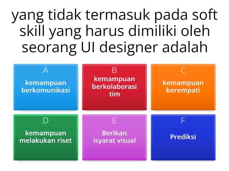 1) yang tidak termasuk pada soft skill yang harus dimiliki oleh seorang UI designer adalah a) kemampuan berkomunikasi b) kemampuan berkolaborasi tim c) kemampuan berempati d) kemampuan melakukan riset e) Berikan isyarat visual f) Prediksi 2) Kata "konsisten" dalam dunia desain UI, itu berlaku untuk a) filosofi desain b) desain produk c) visual dan interaksi d) penggunaan warna e) menciptakan identitas pengguna f) memunculkan ciri khas pemilik produk 3) pilihlah desain ui dan ux yang benar a) b) c) d) e) f) 4) Penggunaan jenis huruf yang tepat dalam sebuah desain sangat penting karena elemen ini berperan sebagai a) penentu kualitas produk b) penentu jumlah pengunjung website c) penentu kualitas merek d) penentu tingkat keterbacaan pengguna e) kenyamanan berinteraksi f) jelas dan informatif